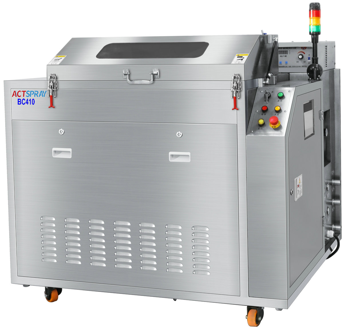 BC410 SMT Solder Paste Printing Squeegee Cleaning Machine The BC410 is specially designed for the automatic cleaning of SMT solder paste printing squeegees. The squeegee is fixed on a rotary bracket inside the cleaning chamber, with the bracket rotating during the cleaning process. It leverages the physical forces of ultrasonic vibration and spray jetting, as well as the chemical decomposition capability of water-based solder paste cleaning fluid, to decompose, remove and thoroughly clean the solder paste residues on the surface, in the corners and gaps of the squeegee. After cleaning, the squeegee is rinsed with clean water and finally dried with hot air.
