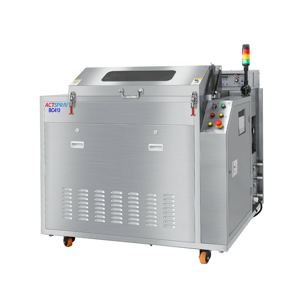 BC410 is specifically designed for automatic cleaning of SMT solder paste printing scrapers. The scraper is fixed on the rotating bracket in the cleaning room, and the bracket rotates; By utilizing the physical forces of ultrasonic vibration and spray spraying, as well as the chemical decomposition ability of water-based solder paste cleaning solution, the residual solder paste on the surface, corners, and gaps of the scraper is decomposed, taken away, cleaned, rinsed with clean water, and finally dried with hot air.
