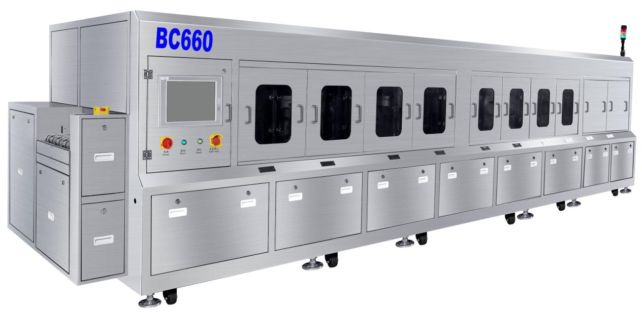 The BC660 PCBA in-line cleaning machine is mainly used for the automatic cleaning of residual flux on PCBA pads and surfaces. It adopts a sectional upper and lower spray cleaning method with the process of chemical fluid cleaning + DI water rinsing + hot air drying, which completely removes flux and ionic residues on PCBA and ensures it is thoroughly clean and dry. Machine Dimensions: L6600*W1800*H1700 (mm)