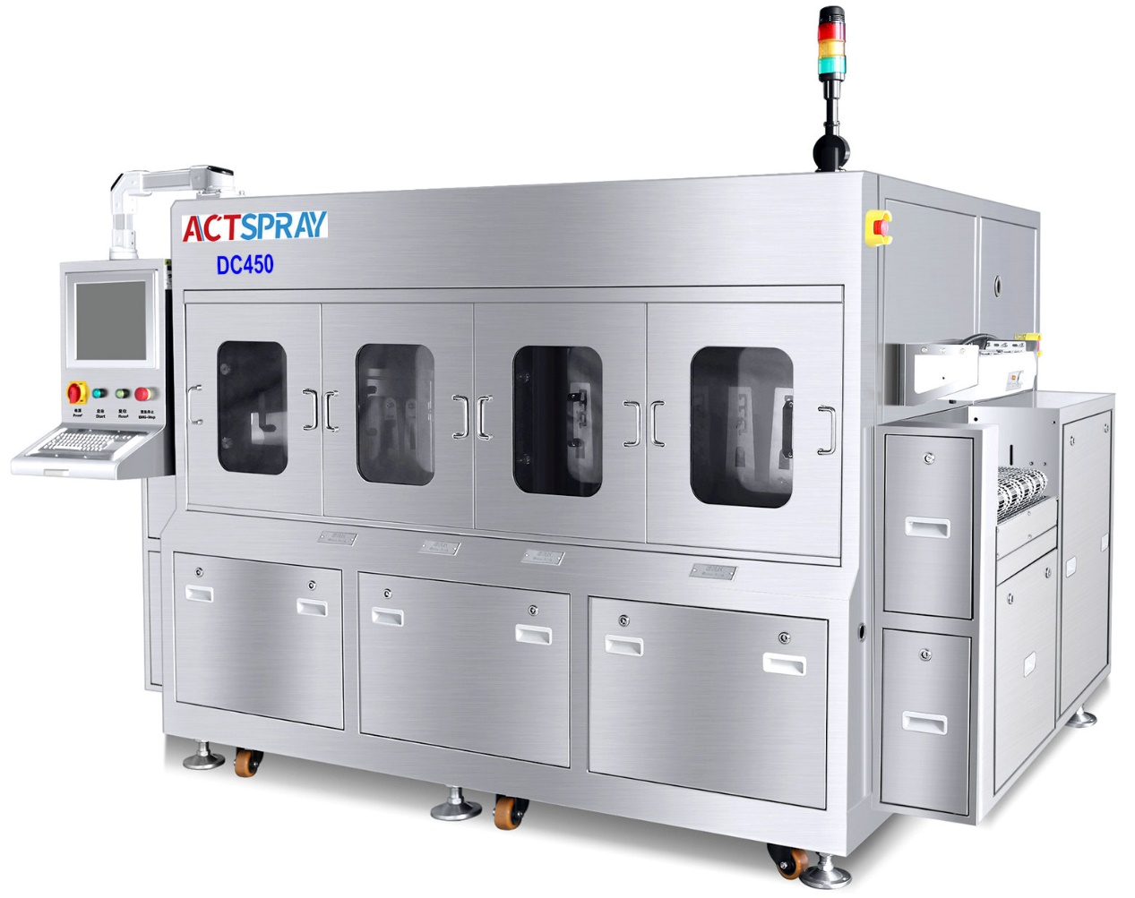 The DC450 is mainly used for the automatic cleaning of water-soluble flux on PCBA and particulate contaminants on other products. The machine consists of a PC+PLC control unit, a stainless steel mesh belt conveying unit, a DI water spray cleaning unit, a DI water spray rinsing unit and a hot air unit. Machine Dimensions: L4500*W1800*H1750 (mm)