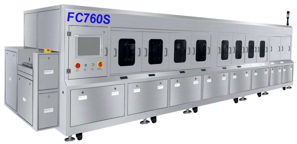 FC760S Advanced Packaging Substrate Flux Residue Cleaning Machine The FC760S is specially designed for the automatic cleaning of flux residues on advanced packaging substrates such as FCBGA/FCCSP/FCLGA. The equipment adopts a PC+PLC control system and a stainless steel mesh conveying system, with an upper and lower spray cleaning method using cleaning fluid and DI water to thoroughly remove flux residues on the substrates. IC substrates are conveyed from the machine’s board inlet to the internal stainless steel mesh belt, pass through the functional zones of cleaning, chemical isolation, rinsing, air knife drying and hot air drying in sequence at a preset mesh speed, and are then delivered out from the machine’s board outlet.