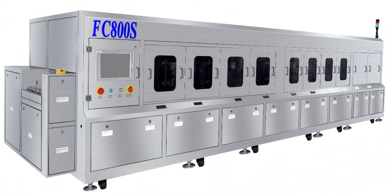 FC800S Advanced Packaging Substrate Flux Residue Cleaning Machine The FC800S is specially designed for the automatic cleaning of flux residues on advanced packaging substrates such as FCBGA/FCCSP/FCLGA. The equipment adopts a PC+PLC control system and a stainless steel mesh conveying system, with an upper and lower spray cleaning method using cleaning fluid and DI water to thoroughly remove flux residues from the bottom gaps of SIP modules. IC substrates are conveyed from the machine’s board inlet to the internal stainless steel mesh belt, pass through the functional zones of cleaning, chemical isolation, rinsing, air knife drying and hot air drying in sequence at a preset mesh speed, and are then delivered out from the machine’s board outlet.